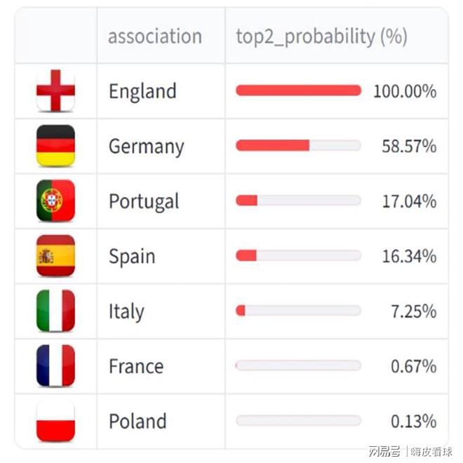 根据专业足球数据机构Football Meets Data的分析,英超已经百分百确定前两名,德甲获得另外一个奖励名额的机会也超过五成。目前,德甲只有法兰克福在欧冠出局,拜仁慕尼黑、弗赖堡和美因茨均直通16强,勒沃库森、多特蒙德和斯图加特附加赛首回合均至少手握两球优势,因此保住第二名的希望是很高的。