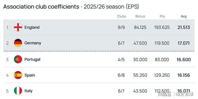 欧足联公布了最新的积分榜,英超以21.513分排在第一,领先第二名的德甲超过4分。葡超、西甲和意甲分别排在第三到第五名,除了英超之外,前5名的积分差距不到1分,竞争相当激烈。第6名的波兰只有14.125分,第7名的法甲只有14.035分,落后比较多,基本上没有机会进入前两名。