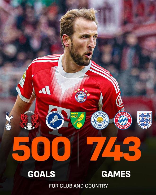 凯恩743场打入500球,速度超越C罗!仅逊于梅西